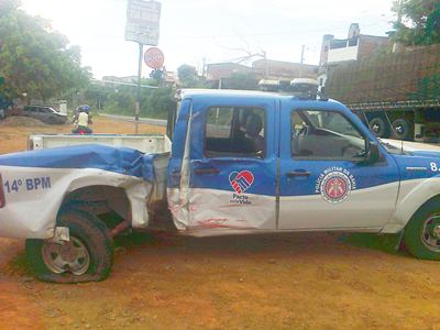 Por pouco não ocorria uma tragédia. Um caminhão que pertence a uma empresa distribuidora de frangos colidiu com uma viatura da PM na manhã desta quarta-feira (05) por volta das 7h, no Bairro Alto Santo Antônio, na BR-101, em Santo Antônio de Jesus. Luís César, motorista do caminhão de placa policial NYX 5554, informou que estava na sua mão correta quando a viatura de placa policial JSX 4461 saiu do Bairro Alto Santo Antônio atravessando em sua frente, nesse momento o mesmo não teve como parar para evitar o acidente e acabou batendo na lateral do carro.